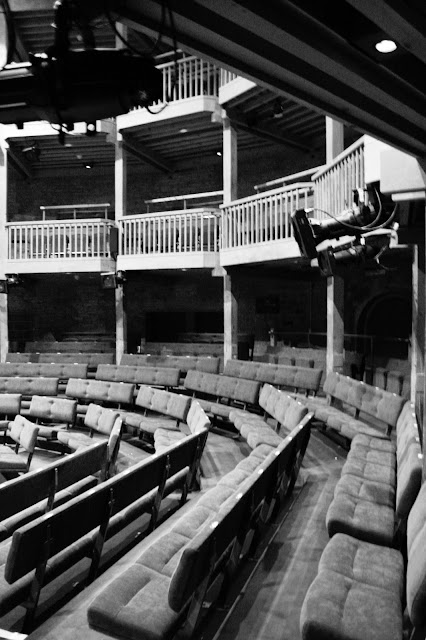 Black and white is perfect for this building which even looks Shakespearean with the curving staircases, balconies, wide hallways, etc. I would so love to attend a performance there. Thanks for showing us.